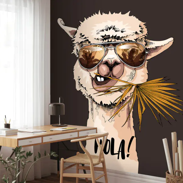 65.98 lei39.59 leiFototapet O lama care poartă ochelari de soare și mănâncă o frunză