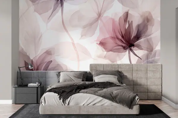 Dacă ai un stil rustic, alege un fototapet Provence cu peisaj natural. Pentru spații moderne, merge bine un design floral minimalist în nuanțe de mov deschis.