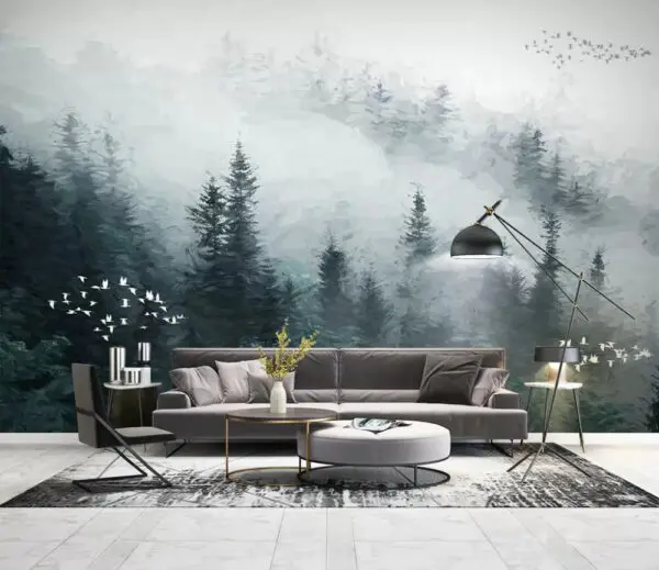 65.98 lei39.59 leiFototapet Acuarelă de copaci și păsări care zboară peste o pădure cețoasă