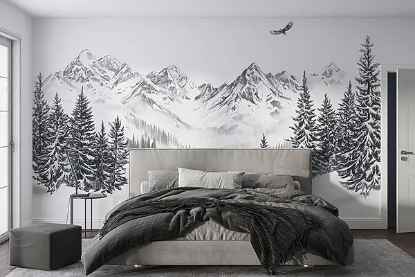 61.67 lei37.00 leiFototapet Snowy peisaj montan cu copaci și o pasăre care zboară peste ea