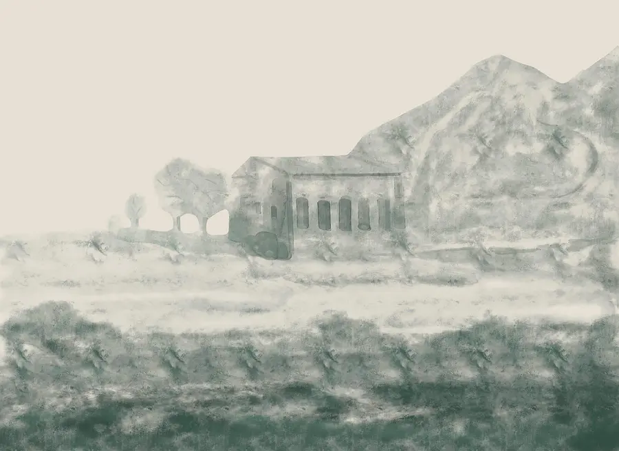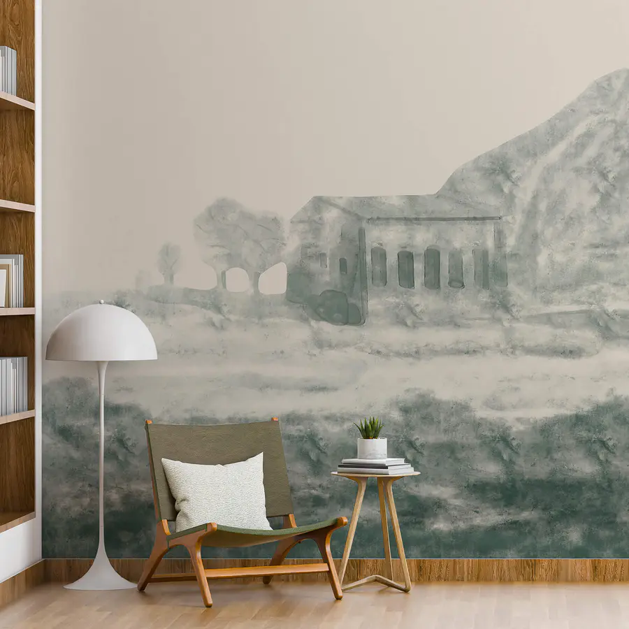 Fototapet Pictura unei clădiri și a unui munte