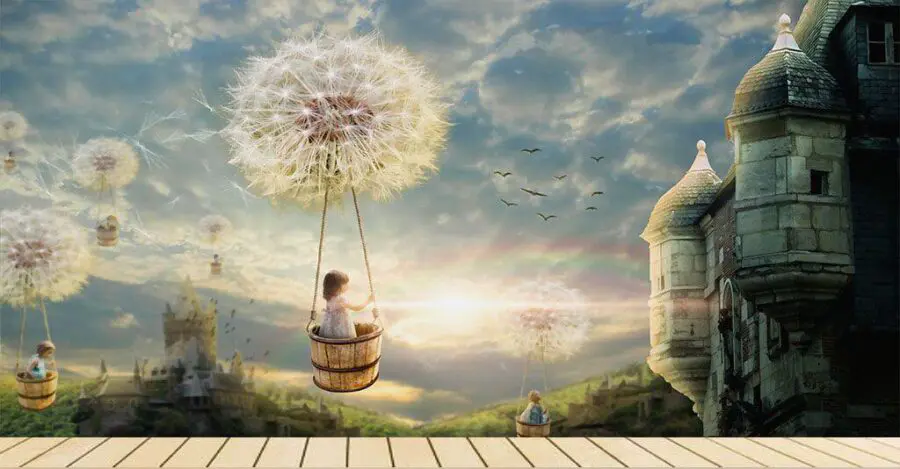Fototapet Fată într-un coș pe un leagăn cu o păpădie în cer