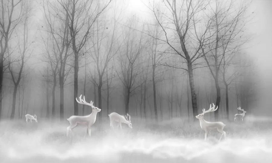 Fototapet Grup de căprioare albe într-o pădure cețoasă
