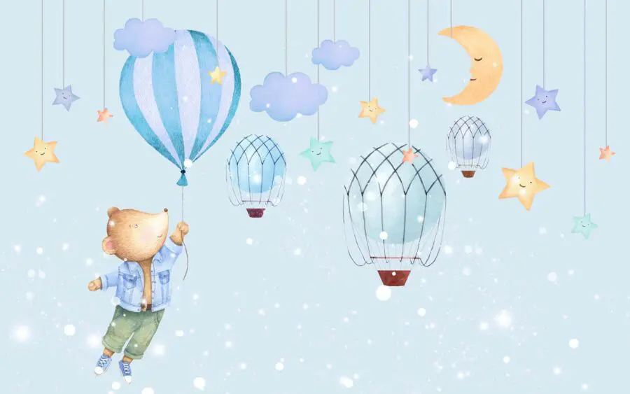 Imaginați-vă o scenă capricioasă în care un urs vesel pornește într-o aventură, plutind printre nori moi și stele sclipitoare. Această pictură murală, cu albastru delicat și elemente de vis, aduce un strop de magie în orice cameră. Imaginați-vă-o pe peretele unei grădinițe, creând un spațiu confortabil și jucăuș, unde chicotelile și visele prind viață. Ursul, care își ține balonul în mână de parcă ar fi cel mai important lucru din lume, ne reamintește să ne bucurăm de momentele mici. Este perfect pentru a spune povești - doar așteptați până la ora de culcare! Acest design fermecător adaugă caracter și căldură, invitându-i pe toți să viseze puțin cu ochii deschiși.
