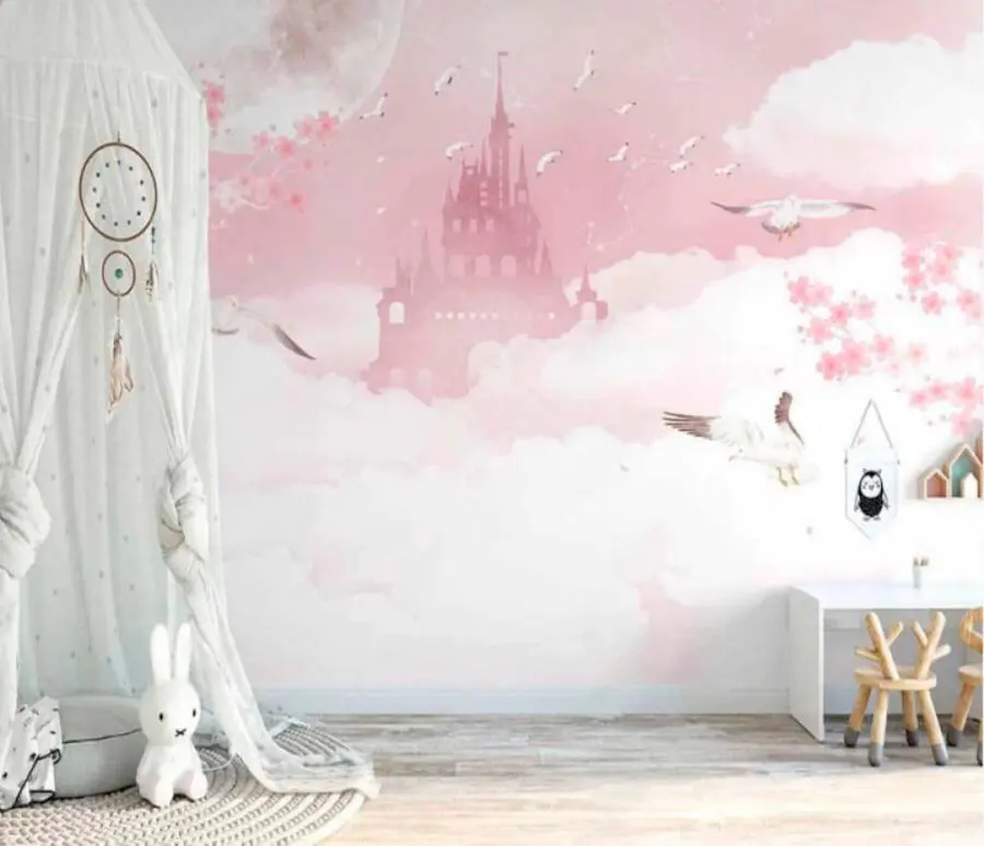 Imaginați-vă că intrați într-o cameră și sunteți purtați instantaneu într-o scenă de vis desprinsă dintr-un basm - destul de frumos, nu? Această pictură murală "Castel cu păsări zburând pe cer" este magie pură. Are de toate: un castel maiestuos care se zărește printre norii moi și pufoși, o lună plină uriașă care luminează florile roz de cireș și păsări care zboară de parcă cerul le-ar aparține. Perfectă pentru camera unei fete sau pentru orice spațiu care are nevoie de un pic de fantezie, această pictură murală este extraordinară. Imaginați-vă fața unui micuț care se luminează când intră, minunându-se de propriul său regat al cerului. Este aproape ca și cum ai avea o fereastră într-o lume fantastică în care totul pare posibil. Rozul blând și albul creează o atmosferă atât de liniștitoare - pașnică și totuși atât de plină de mirare. În plus, nu-i așa că lumina lunii radiază vise și aventuri nocturne blânde? Nu este doar o pictură murală; este o invitație de a lăsa imaginația să zburde liberă. Deci, sunteți gata să transformați un perete într-o scenă de poveste? Asta ar putea fi!
