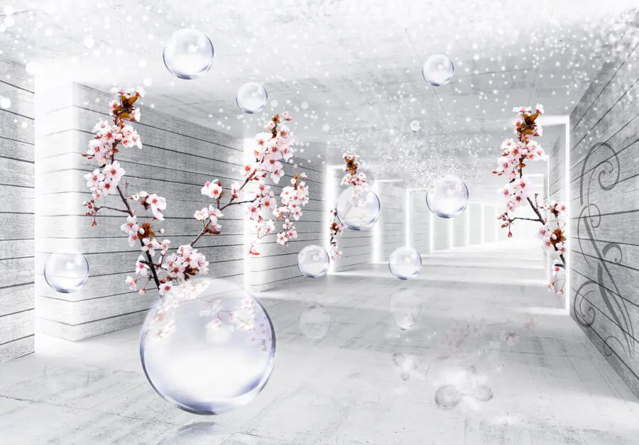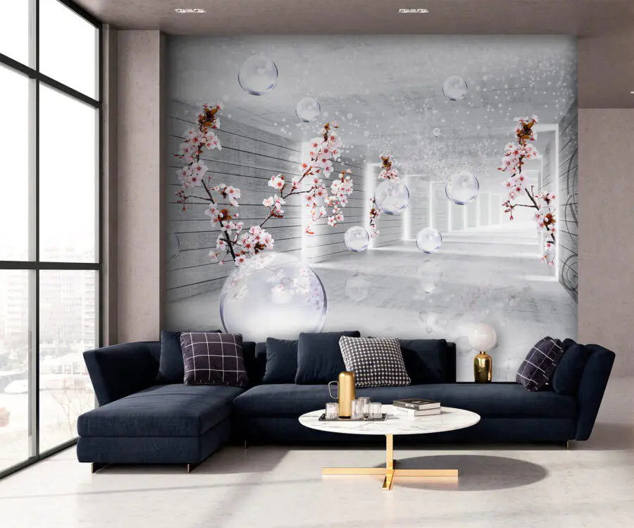 Fototapet Cameră albă cu flori și bule