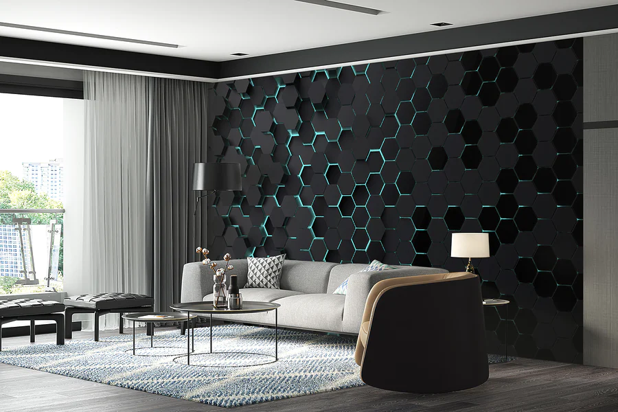Fototapet Hexagoane negre cu lumini albastre