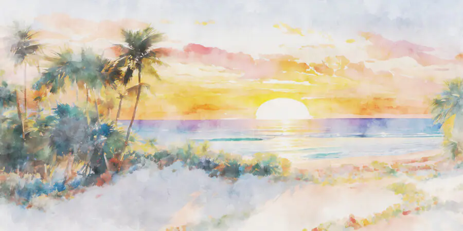 63.91 lei35.15 leiFototapet Acuarelă de o plajă cu palmieri și un apus de soare