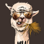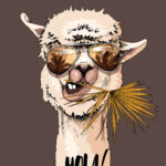 Fototapet O lama care poartă ochelari de soare și mănâncă o frunză