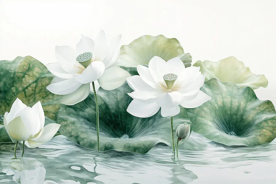 Fototapet Grup de flori albe și frunze verzi în apă