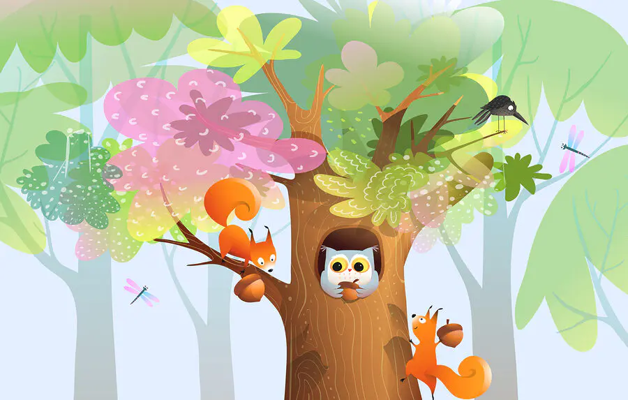Fototapet Desen animat de animale într-un copac