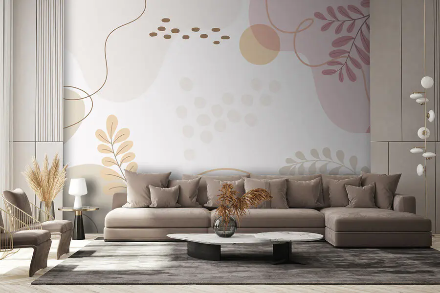 Fototapet Fundal alb cu frunze și cercuri roz și portocalii