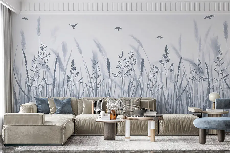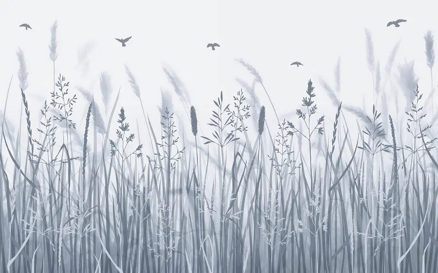 Fototapet Câmp de iarbă cu păsări care zboară