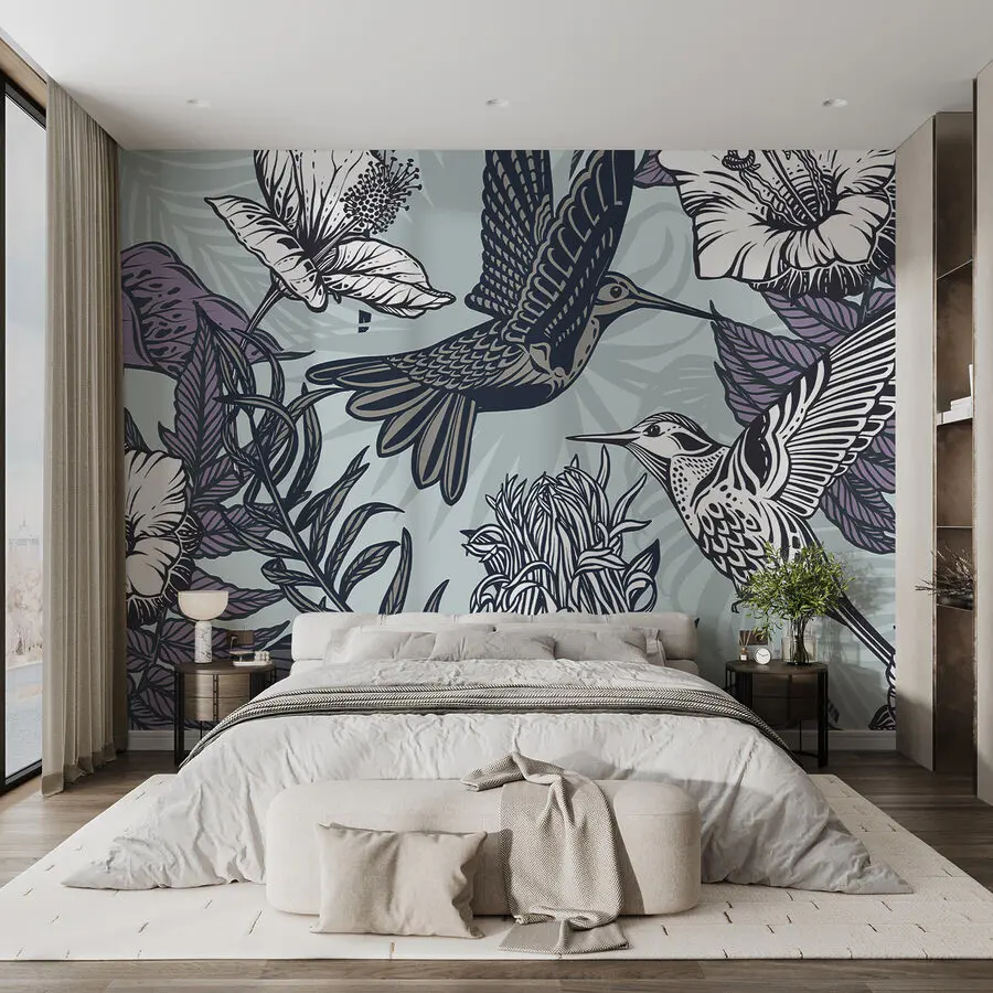 Fototapet Pasăre care zboară lângă flori