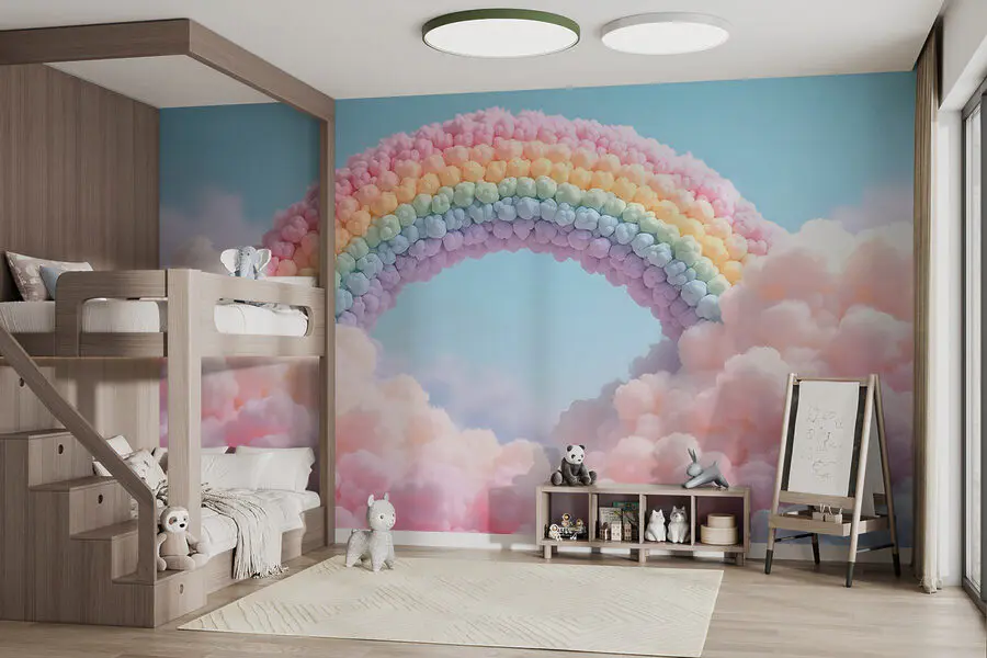 Transformați-vă spațiul într-o evadare de vis cu acest capricios "Fototapet Rainbow made of Clouds". Este ca o felie de rai de vată de zahăr, chiar pe pereții tăi! Imaginați-vă că vă treziți și sunteți întâmpinați de nori pastel și un curcubeu care pare să plutească doar pentru dvs. Perfectă pentru o cameră de copil sau pentru un colț de lectură confortabil, această pictură murală adaugă o notă de magie oricărei încăperi. Fiecare privire la acești nori pufoși aduce un zâmbet, stârnind o bucurie precum găsirea unui cartof prăjit în plus pe fundul pungii. Nu este doar decor; este o vibrație care te face să te simți bine, transformând un perete obișnuit într-un vis cu ochii deschiși. Vorbim despre un starter de conversație!