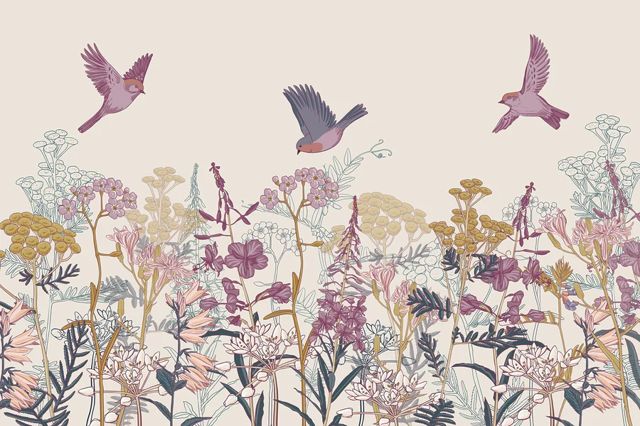 Fototapet Păsări care zboară peste flori