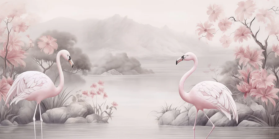 Transformați orice perete într-o evadare senină cu pictura murală "Flamingo într-un lac". Imaginați-vă două flamingo elegante înotând într-un lac blând, înconjurate de nuanțe moi, de vis și de flori delicate - este ca și cum ați păși într-o grădină japoneză liniștită, fără țânțarii enervanți. Imaginați-vă sorbind un ceai, simțind briza, poate chiar prefăcându-vă că sunteți un flamingo - cu un picior în sus și totul. Această pictură murală nu doar decorează; spune o poveste. O poveste care spune: "Da, ai putea locui aici". Este perfectă pentru a crea o oază de calm într-un dormitor sau un punct focal șic în camera de zi. Așa că dați-i drumul, cufundați-vă în acest paradis senin. Pereții tăi îți vor mulțumi!