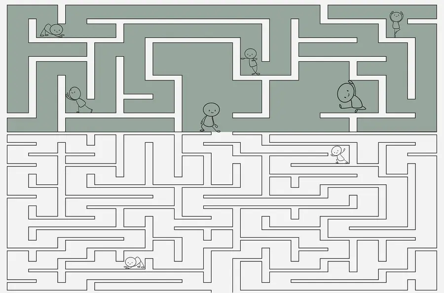 Fototapet Joc labirint cu oameni de desene animate care merg prin labirint