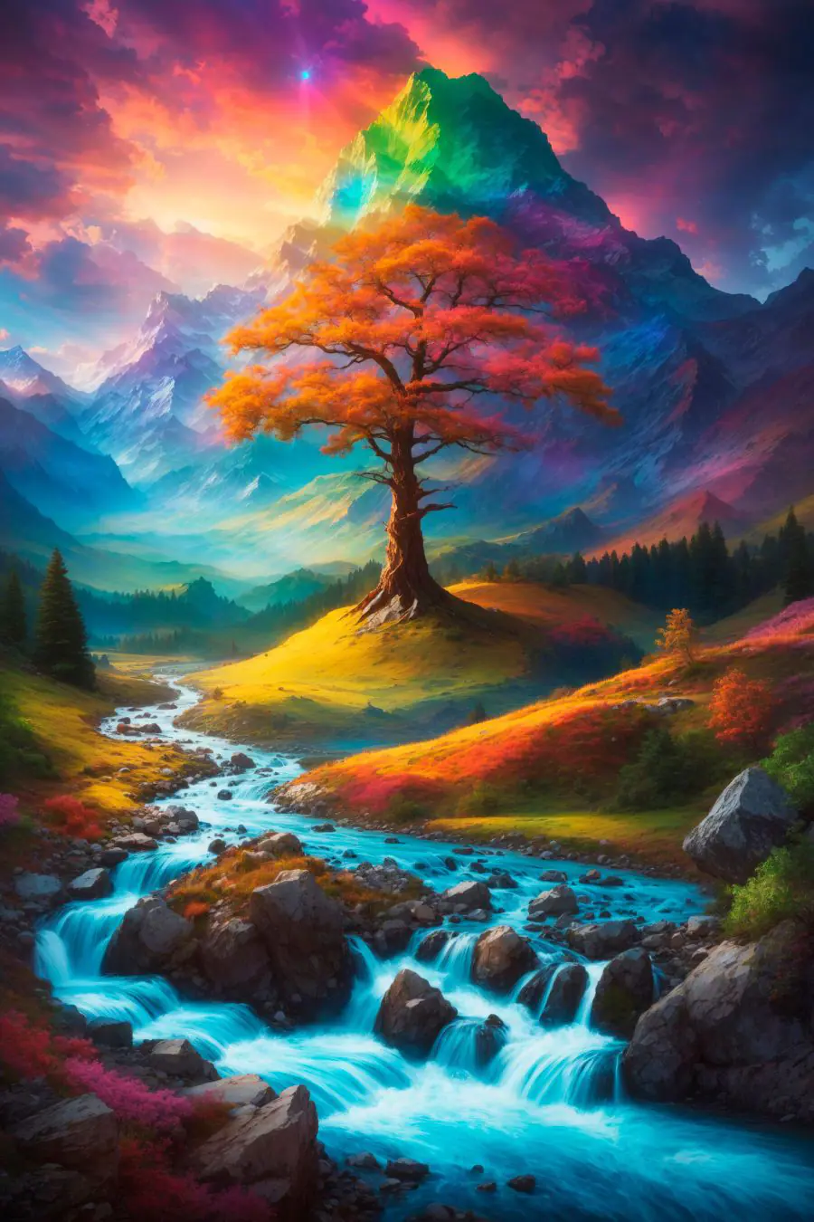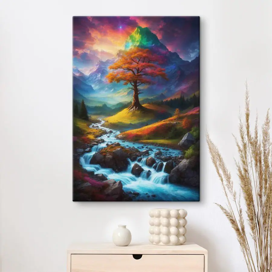 Imaginați-vă acest lucru: vă sorbiți cafeaua de dimineață și priviți "Tablouri River running through a valley with a tree in the middle". Instantaneu, sunteți transportat într-o vale liniștită, unde râul șoptește pietrelor secrete. Acel copac? Nu este doar înrădăcinat în pământ - este înrădăcinat în sufletul tău. Culorile au un fel de a dansa, ca și cum natura ar fi decis să picteze cu o pensulă curcubeu. Perfect pentru oricine a visat vreodată să evadeze într-o țară a minunilor capricioasă fără să părăsească confortul sufrageriei sale.