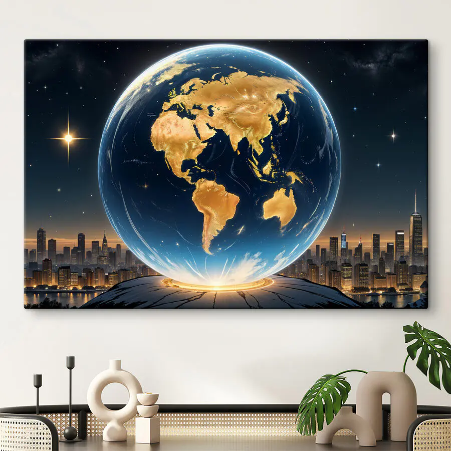 Apropiați-vă și lăsați această imprimare pe pânză să vă ducă într-o călătorie aventuroasă! Cu un glob care strălucește de lumini, este o piesă care cere să fie piesa centrală a oricărei camere. Imaginați-vă că o priviți și vă simțiți inspirați să explorați lumea - fie că asta înseamnă să planificați o călătorie sau doar să visați de pe canapea. Culorile vibrante sunt ca o îmbrățișare pentru pereții dvs., aducând o căldură care va face orice spațiu să se simtă mai confortabil. Perfectă pentru biroul de acasă sau pentru camera de zi, această imprimare vă îndeamnă să gândiți mai mult, să visați mai mult și poate chiar să vă îndreptați spre stele - la propriu. Cine ar fi crezut că decorul poate alimenta dorința de călătorie?