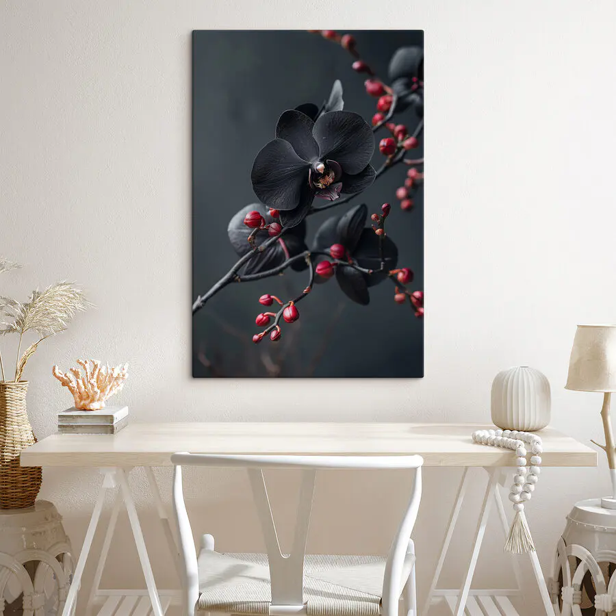 Transformați orice perete într-un subiect de conversație cu această imprimare captivantă pe pânză. Cu o floare neagră uimitoare împletită cu boabe roșii vibrante, este ca și cum natura ar fi decis să intre în arta modernă. Imaginați-vă că treceți zilnic pe lângă ea și de fiecare dată stârnește un gând sau o stare de spirit diferită - eleganța gotică întâlnește partea sălbatică a naturii. Este perfect pentru cineva care nu se teme să iasă în evidență. Fie că luminează un colț de lectură confortabil sau adaugă farmec unui living șic, va atrage privirile și poate chiar câteva complimente. Ca florile într-o zi mohorâtă, această piesă aduce atât intrigă, cât și căldură.