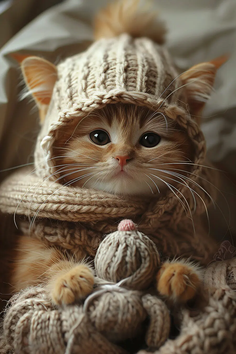 Tablouri Pisică purtând o pălărie tricotată și o eșarfă