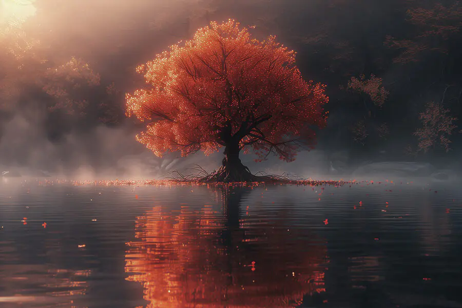 Tablouri Copac cu frunze portocalii pe el într-un lac