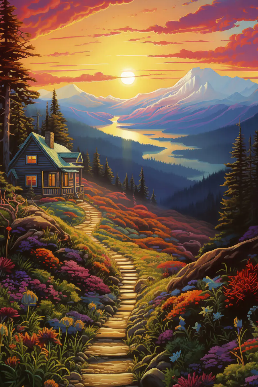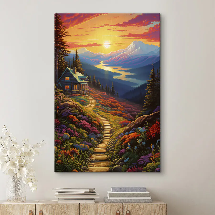 Tablouri Casă pe un deal cu o cărare care duce la o vale cu munți și un râu