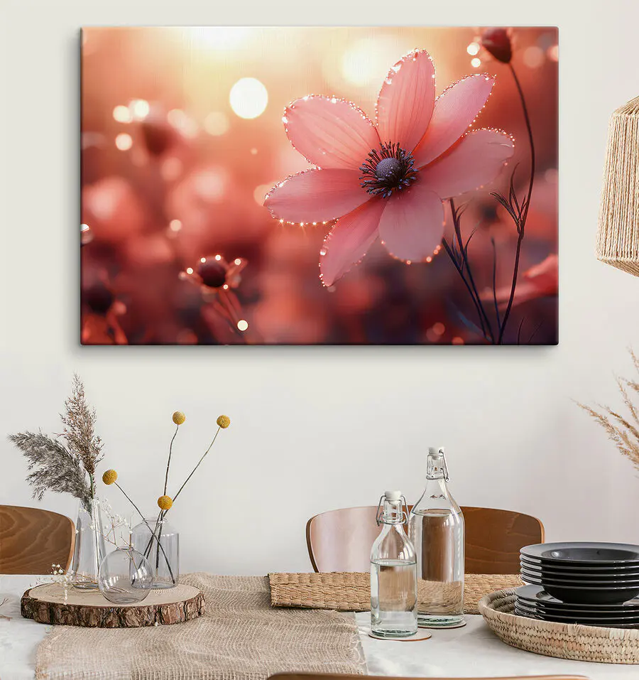 Luminează-ți spațiul cu această imprimare uimitoare pe pânză cu o floare roz acoperită de picături de apă - o adevărată mărturie a frumuseții naturii. Este ca o mică felie dintr-o grădină de dimineață, capturând strălucirea blândă a răsăritului cu petale care par să danseze în briză. Imaginați-vă acest print agățat într-un colț confortabil sau înveselind o cameră de zi. Aduce acea atingere perfectă de liniște, ca o mică amintire a unei plimbări matinale timpurii. În plus, cine nu iubește o floare care arată proaspătă fără a avea nevoie de udare? Perfectă pentru a adăuga un strop de culoare și vibrații bune în orice cameră!