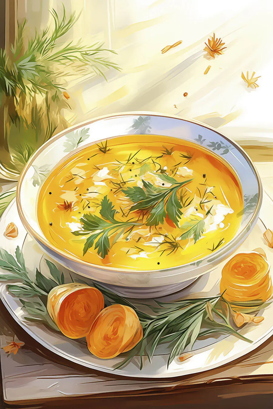 Tablouri Bol de supă cu verdețuri pe o farfurie