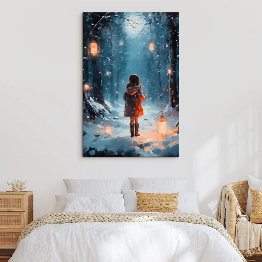 Pășiți într-o țară a minunilor de iarnă capricioasă cu această imprimare pe pânză încântătoare. Imaginați-vă că vă aflați într-o pădure înzăpezită, unde fulgii blânzi dansează prin aer și lumina caldă a felinarelor pâlpâie printre copaci. O fată, îmbrăcată în haina ei confortabilă, pare pregătită să dezvăluie secretele ascunse printre crengile înzăpezite. Este ca o scenă desprinsă dintr-un basm, care vă stârnește imaginația și, eventual, nostalgia aventurilor pe zăpadă. Perfectă pentru a adăuga o notă de magie oricărui spațiu, aceasta invită la visare cu ochii deschiși și la vibrații confortabile. Agățați-o în camera de zi sau într-un colț de lectură liniștit și lăsați-vă cuprins de seninătatea pădurii. Gândiți-vă - acesta ar putea fi decorul perfect pentru a bea cacao fierbinte sau pentru a vă pierde într-o carte bună.
