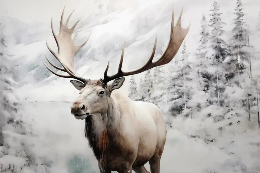 Tablouri Elan cu coarne mari în picioare într-o pădure înzăpezită