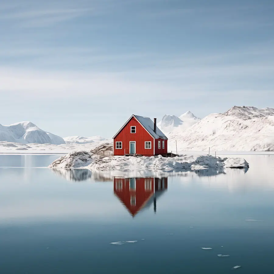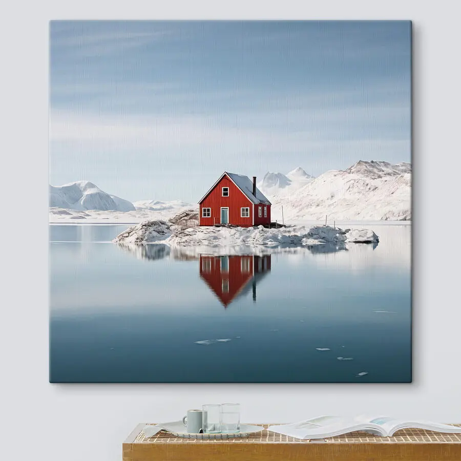 Tablouri Casă roșie pe o insulă în apă cu munți acoperiți de zăpadă în fundal