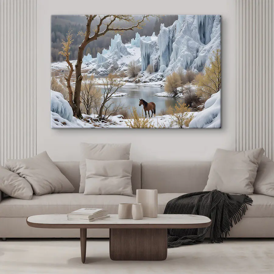 Imaginați-vă acest lucru: un cal maiestuos stând stoic într-o țară a minunilor de iarnă, cu zăpada ștergându-i ușor praful de pe spate, cu un corp de apă liniștit în apropiere. Acest print pe pânză surprinde minunat acest moment senin. Emite o vibrație confortabilă, ca o ceașcă caldă de cacao într-o zi răcoroasă. Imaginați-vă această piesă agățată într-un colț confortabil al casei dvs., invitând la conversație și visând cu ochii deschiși la aventuri înghețate. Perfectă atât pentru iubitorii de animale, cât și pentru pasionații de natură, aceasta transformă orice spațiu într-o evadare senină. În plus, ar putea inspira acea călătorie spontană la munte! Cine nu și-ar dori asta?