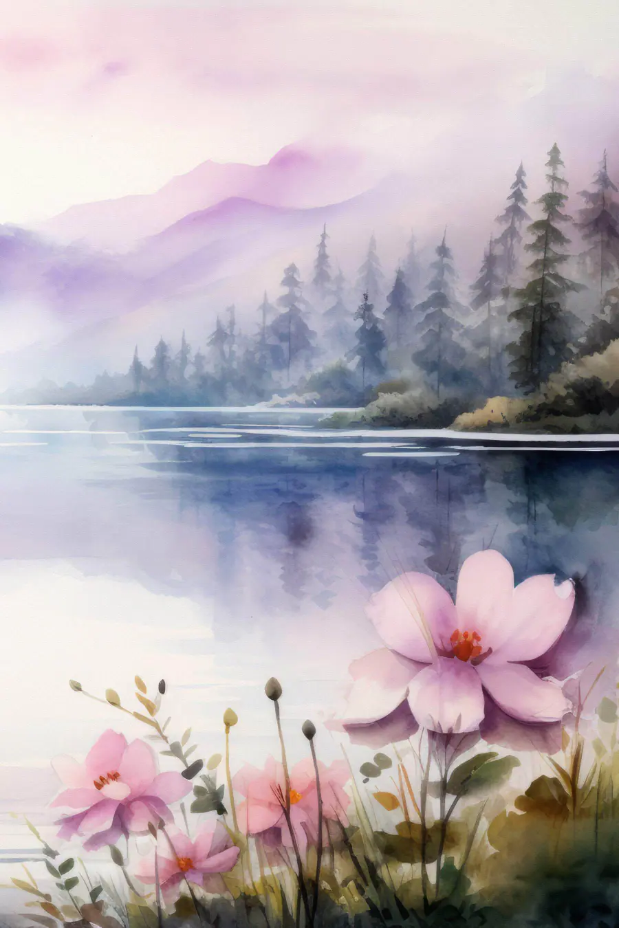 Tablouri Pictură în acuarelă de flori și copaci lângă un lac