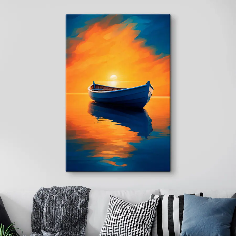 Tablouri Barcă pe apă cu apus de soare în fundal