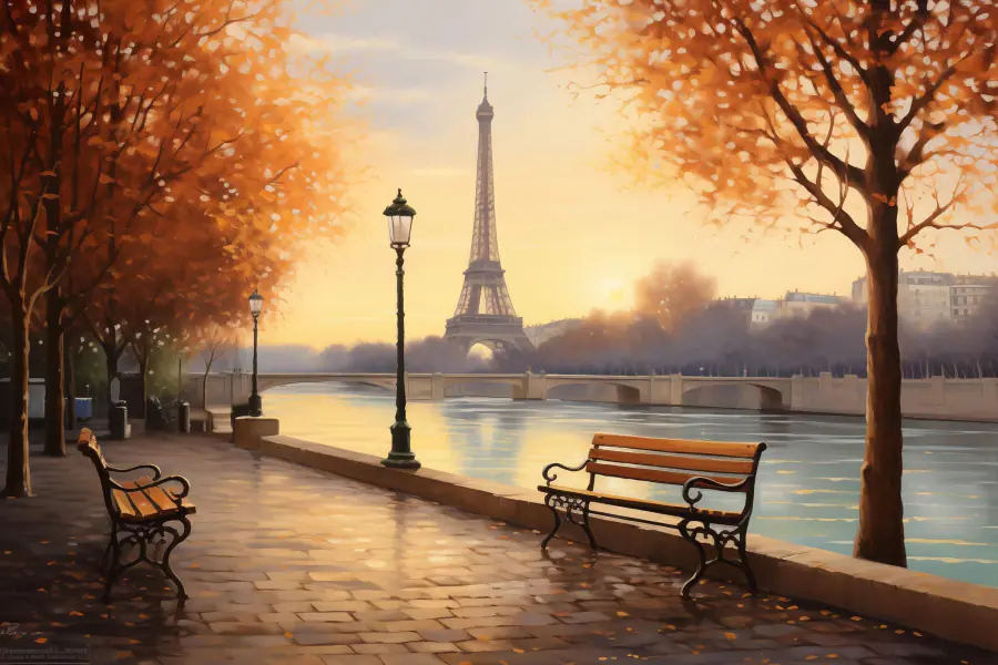 Tablouri Bancă și un râu cu copaci și un turn în fundal