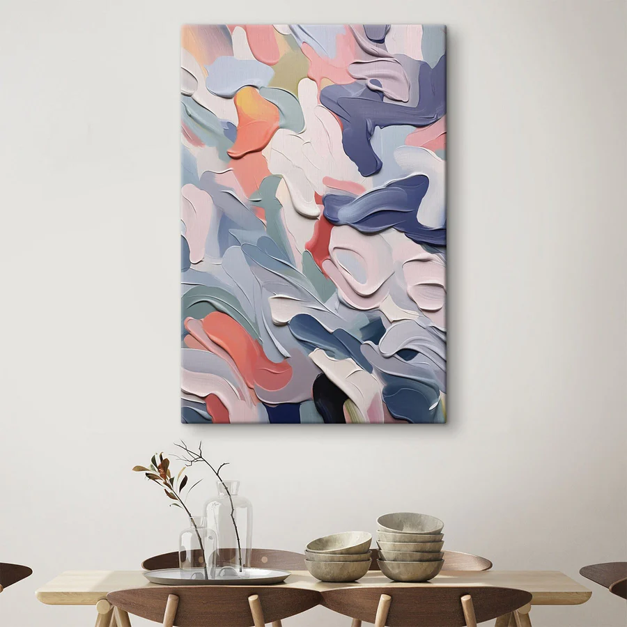 Scufundați-vă în îmbrățișarea liniștitoare a "Valurilor abstracte de culori blânde". Această piesă este ca o șoaptă moale pentru pereții dvs. - perfectă pentru a adăuga o notă de seninătate oricărui spațiu. Imaginați-vă că vă așezați în fotoliul preferat, cu o băutură caldă în mână, și vă lăsați privirea să alunece peste aceste nuanțe liniștitoare. Undele de culoare curg împreună, amintind de un țărm liniștit în amurg. Nu este doar artă; este și un subiect de conversație. Prietenii se pot pierde în valuri, fiecare contur stârnind un gând nou. Aceste pasteluri blânde pot înveseli chiar și cea mai plictisitoare zi, făcându-l o opțiune pentru orice cameră care ar avea nevoie de un pic de calm. Deci, de ce să nu lăsați aceste valuri artistice să vă învăluie decorul? Cu siguranță vor crea o atmosferă confortabilă care invită la relaxare. Decorare plăcută!