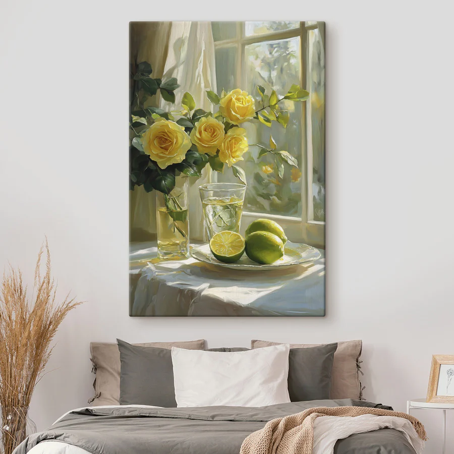 Tablouri Trandafiri galbeni și lămâi pe o farfurie