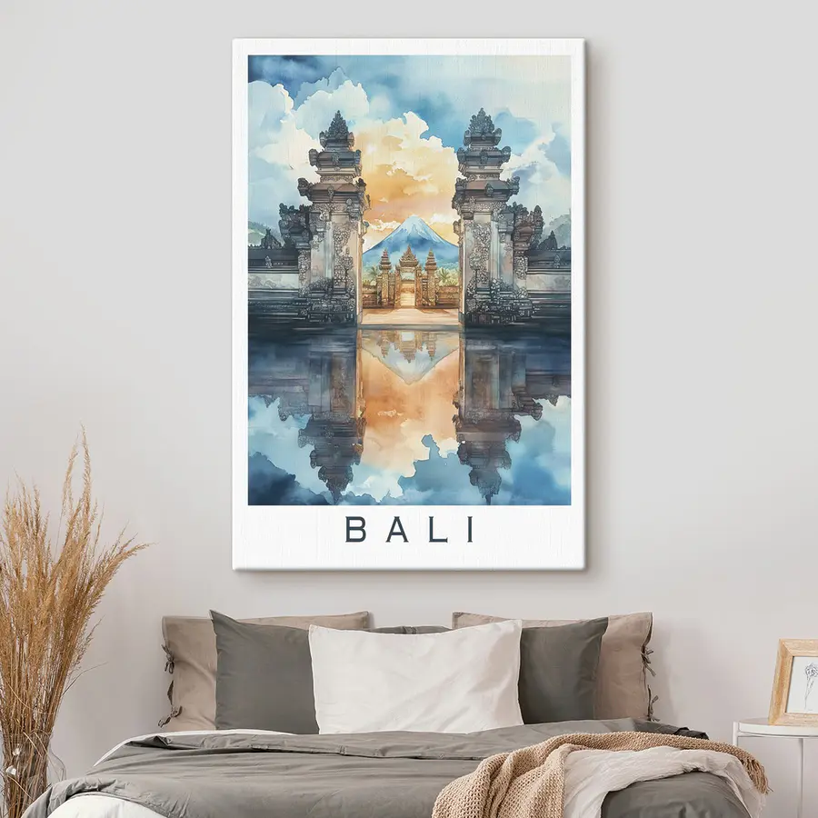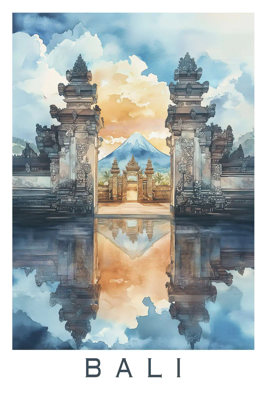 Tablouri Pictură în acuarelă a unui templu cu un munte în fundal